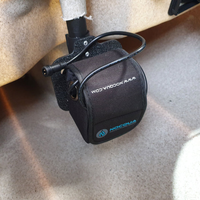 Detta Nocqua-batterifäste är utformat så att du kan fästa Nocqua-batteriet på alla fästen som är 25 mm - 35 mm (1 tum till 1 3/5 tum). Batteriet installeras enkelt genom att kardborrebandet dras genom de två slitsarna och kläms fast. På bilderna är det monterat på Hobie®-segelmastfästet inuti skrovet på en Pro Angler 14.
