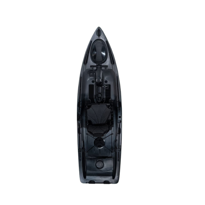 Kajaken är utrustad med ett innovativt sätesystem som enkelt kan justeras mellan sittande och stående positioner, vilket ökar användbarheten och komforten under långa dagar på vattnet. Horisontella spöförvaringar med skydd är strategiskt placerade längs sidorna för snabb åtkomst och säker förvaring av din utrustning.