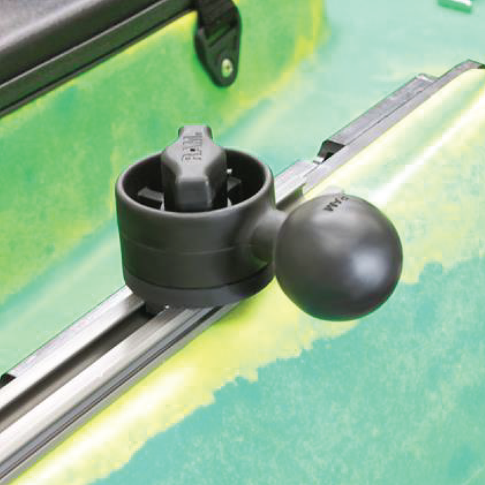 Denna Track Ball från RAM består av en T-bult, vred och en 1,5" C-kula. Med det inbyggda vredet kan du snabbt och enkelt fästa, justera och ta bort basen från ditt befintliga skensystem. Med hjälp av vredet så kan du också flytta fästet längs med skenan och rotera fästet 360 grader parallellt med spåret. Viktkapacitet 1,8 kg.